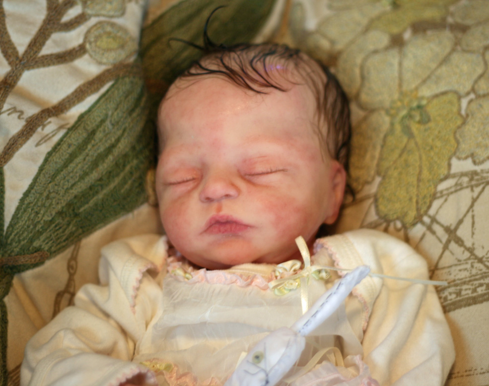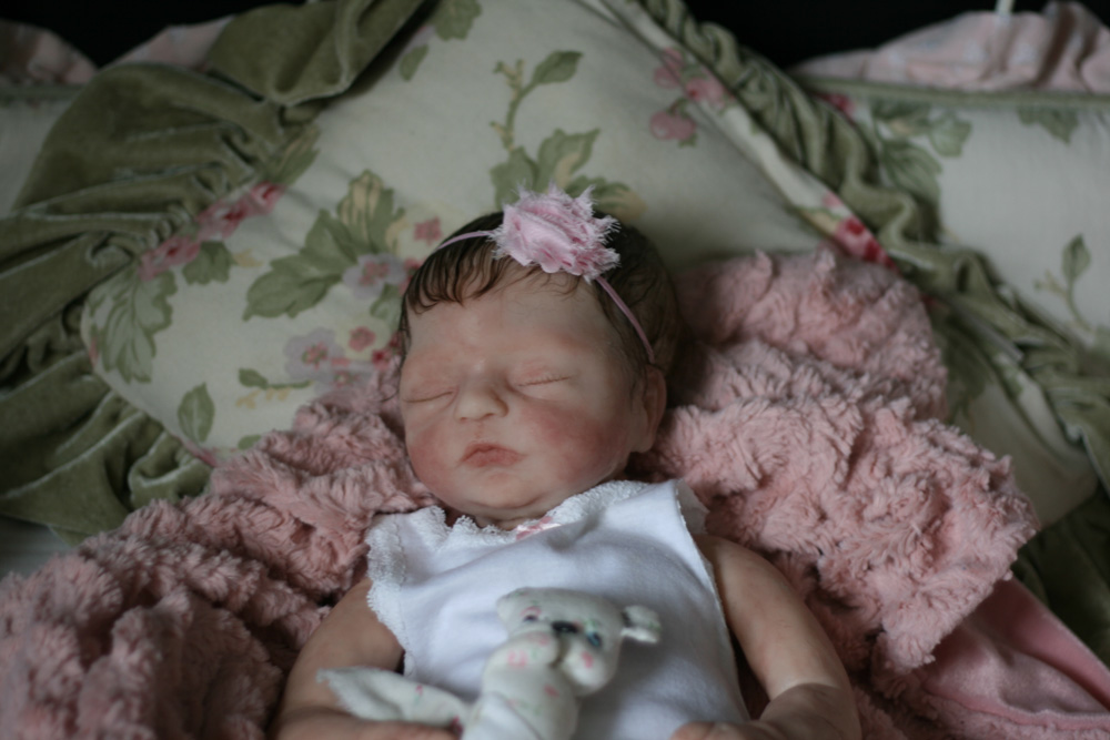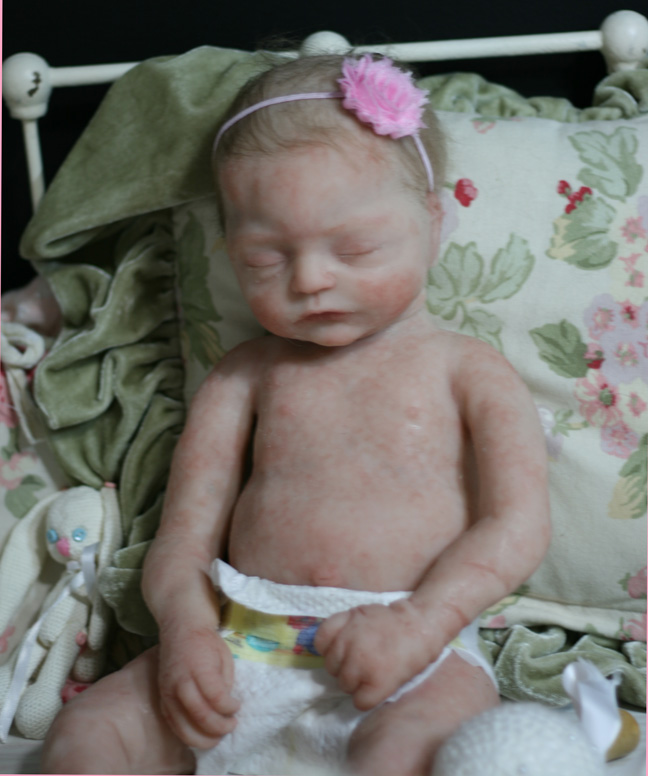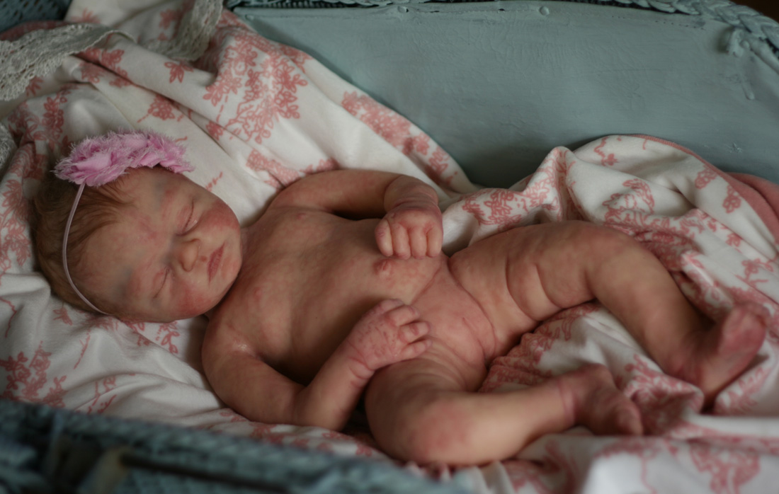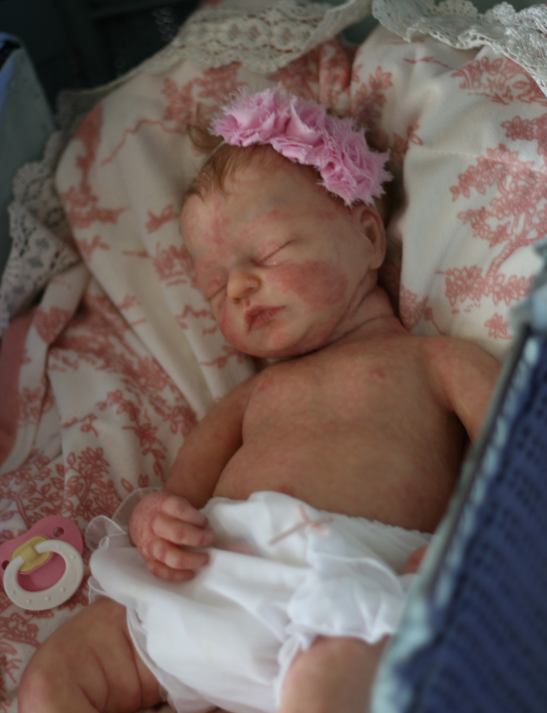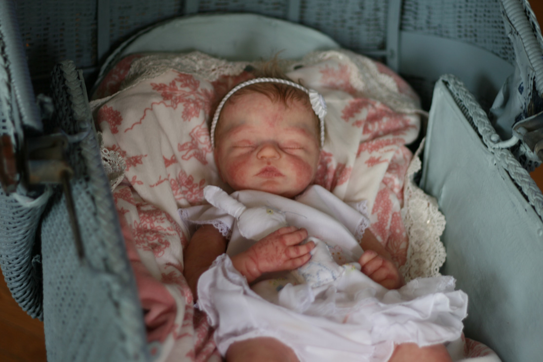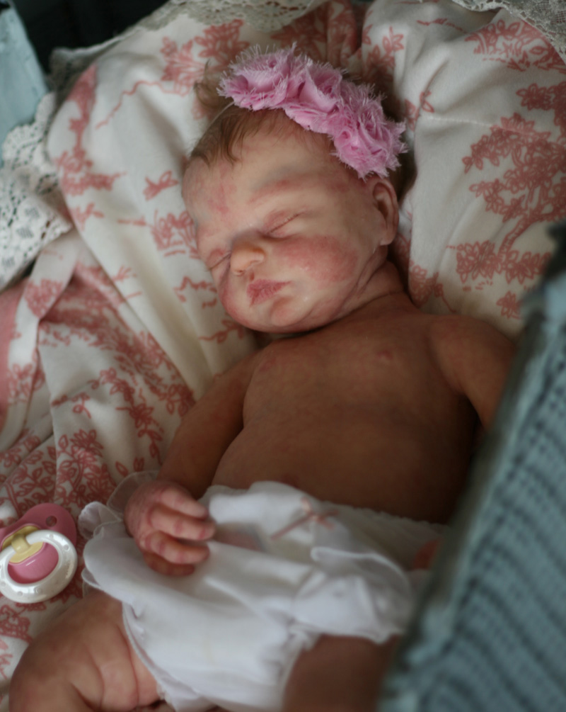 I meticulously hand-painted Elsie-Mae's skin with quality paints to match the slightly mottled life tones of a newborn infant. She has real veining and capillaries under the thinner parts of her skin as well. The silicone I used for Elsie-Mae is the same silicone used in medical prosthetics. The paint I used is designed specifically to adhere to medical prosthetics for use on humans.