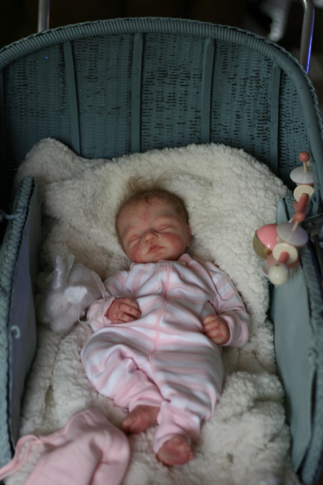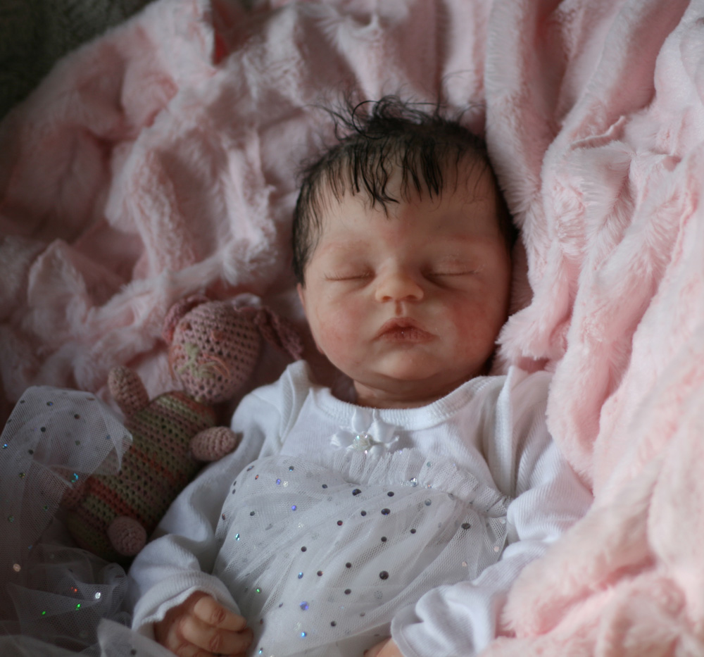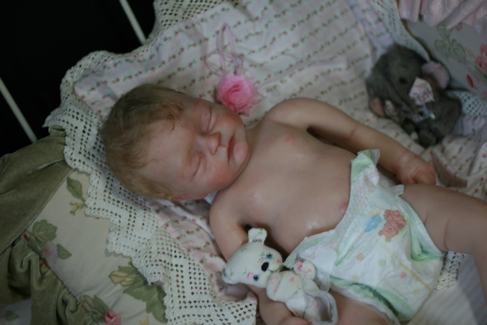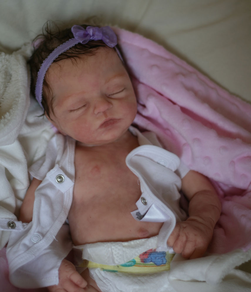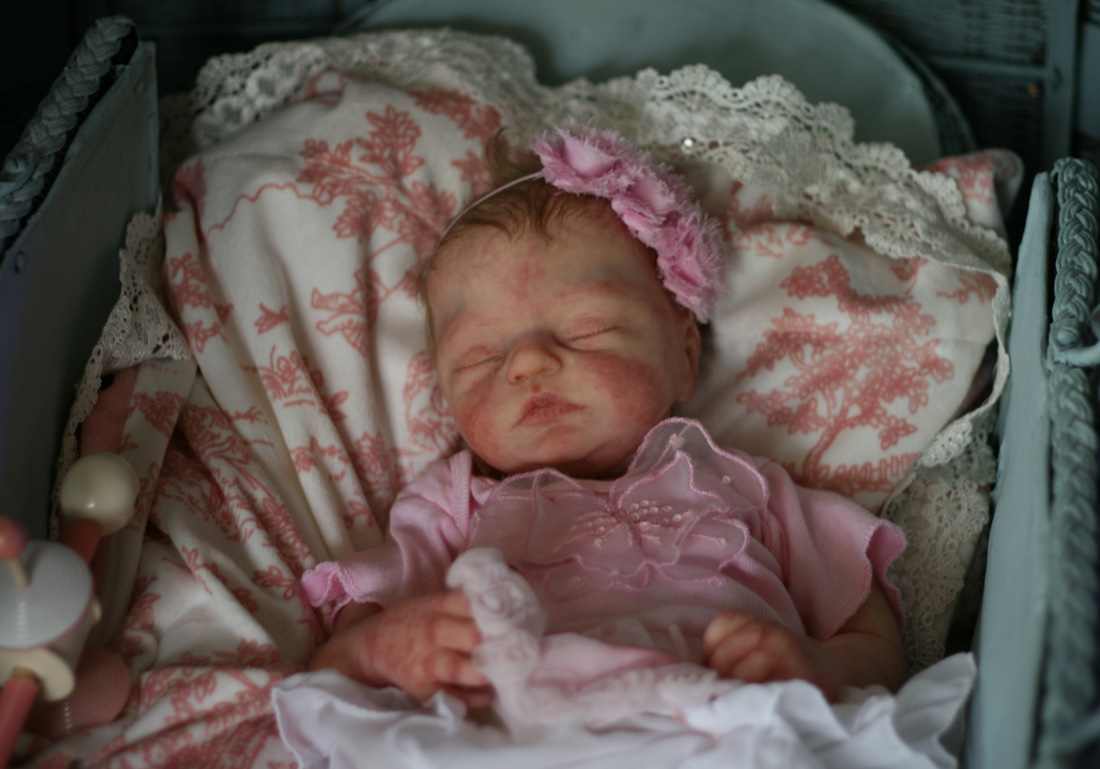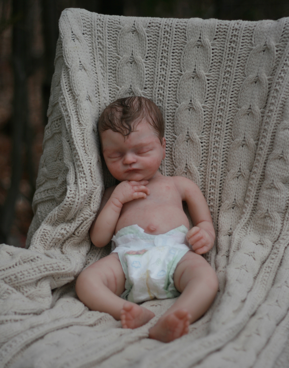 I meticulously hand-painted Elsie-Mae's skin with quality paints to match the slightly mottled life tones of a newborn infant. She has real veining and capillaries under the thinner parts of her skin as well. The silicone I used for Elsie-Mae is the same silicone used in medical prosthetics. The paint I used is designed specifically to adhere to medical prosthetics for use on humans.