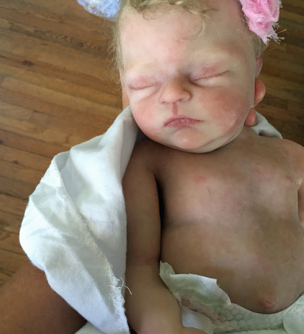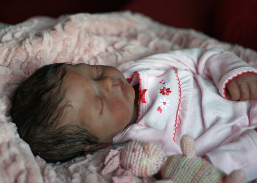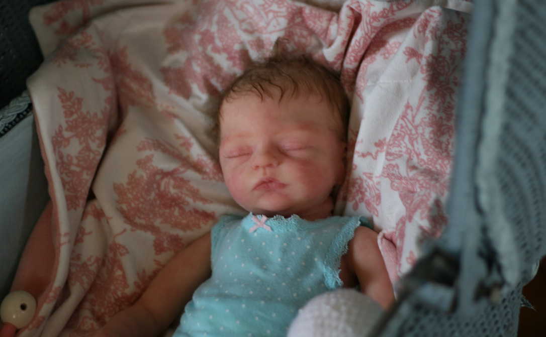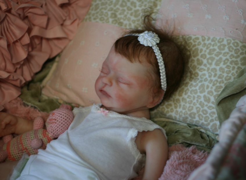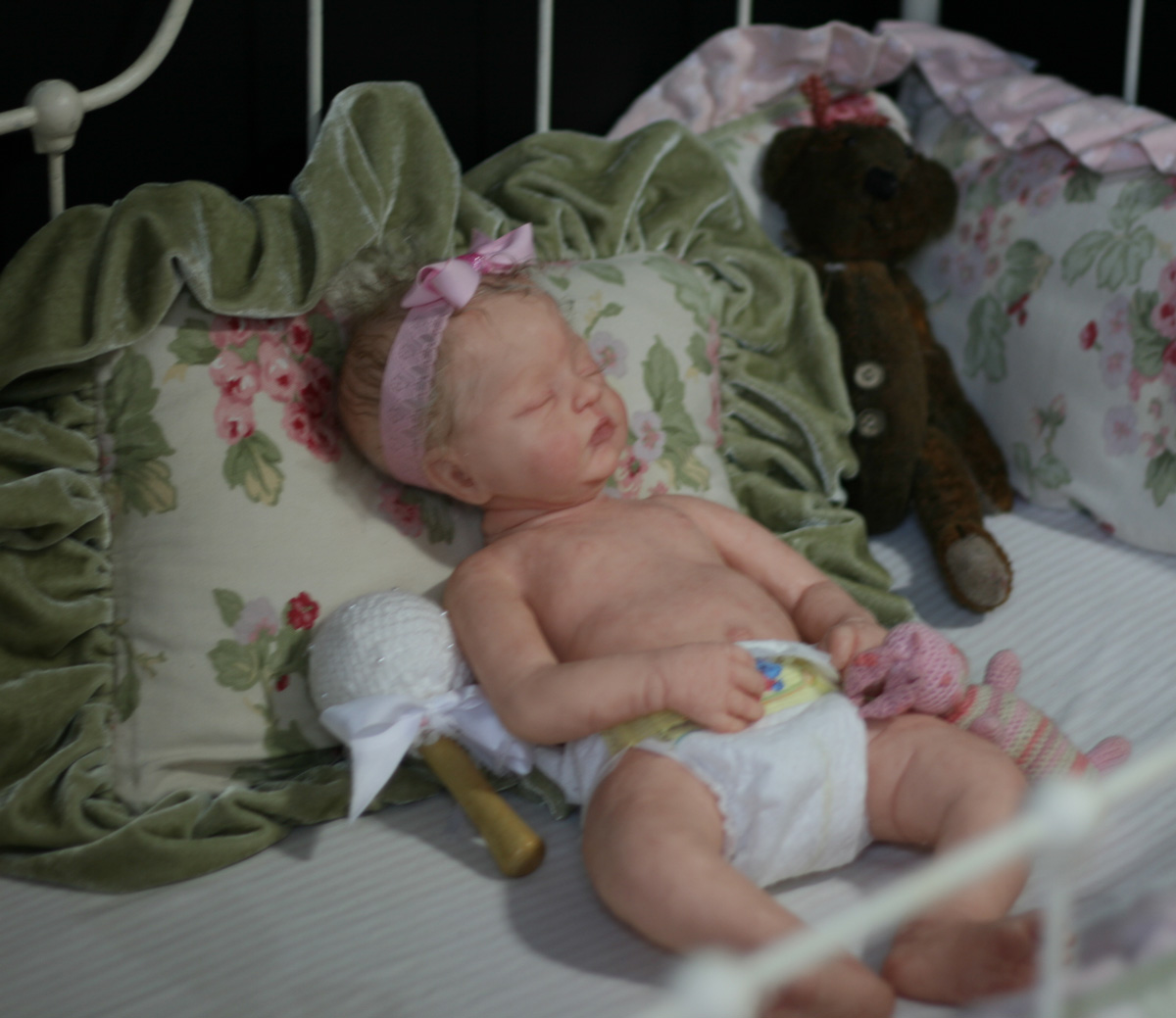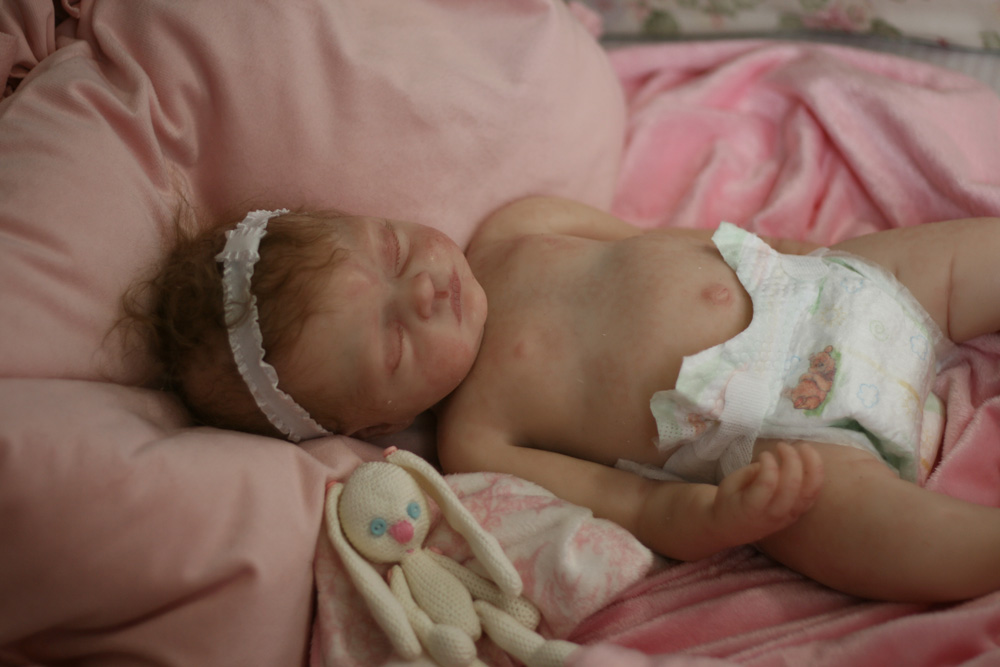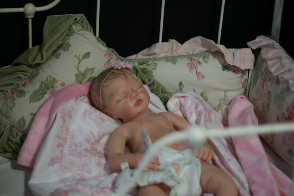 I meticulously hand-painted Elsie-Mae's skin with quality paints to match the slightly mottled life tones of a newborn infant. She has real veining and capillaries under the thinner parts of her skin as well. The silicone I used for Elsie-Mae is the same silicone used in medical prosthetics. The paint I used is designed specifically to adhere to medical prosthetics for use on humans.