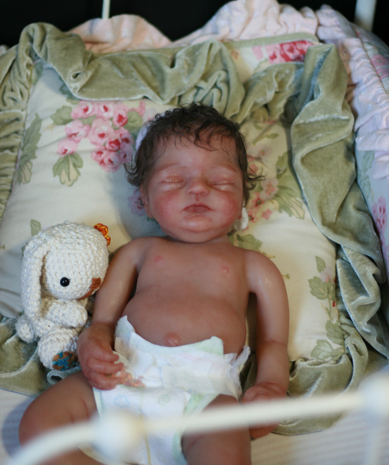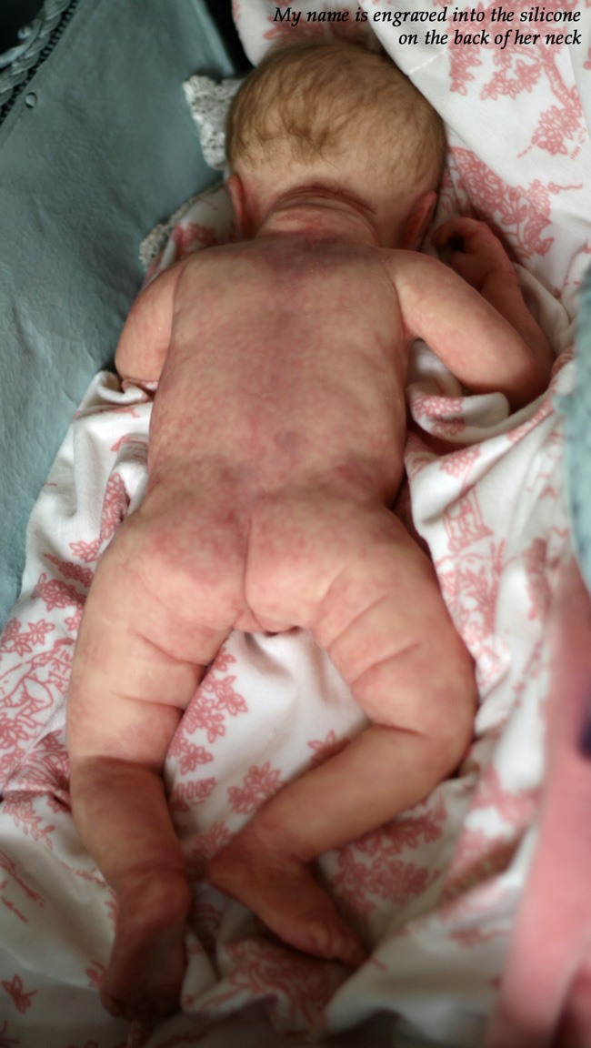 My silicone Elsie-Mae was made entirely by hand!!!! She is a one of a kind piece of art. She may have slight imperfections here or there: like tiny bumps or lines or variations in certain details or the seam line around her neck. This makes each item one of a kind. These are not considered flaws; but are original to the baby exactly the way I sculpted her & how the silicone reproduced her clay sculpture. As much a Elsie-Mae is a FABULOUS replica of an infant, her baby skin around her neck isn't completely "visually" seamless. Elsie-Mae is NOT a perfect manufactured factory made item. If you purchase one of my dolls, please do not expect to receive something "factory" manufactured. They are handmade by an artist....MYSELF :) This is what makes them uniquely special. She is a Collectors Quality Piece of Artwork to be cherished and displayed for generations to come. She is not a child's play toy.