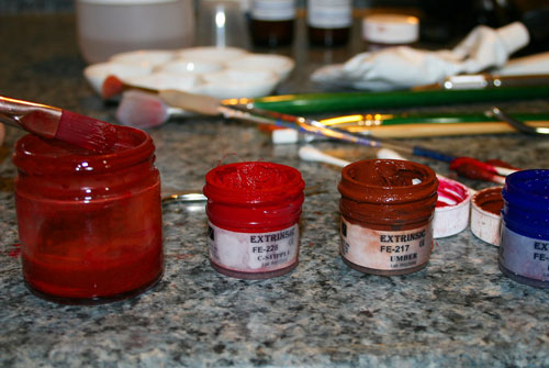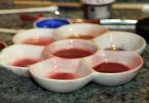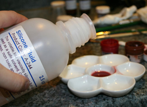 Now take your brush and put a few dabs of this concentrated mixture into 3 of the porcelain-mixing compartments. Add silicone fluid to dilute.