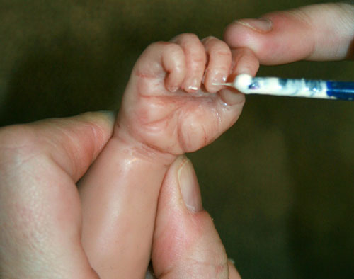 For a newborn baby, I paint color on with a brush in, say, 100 tiny dots to give a blotchy look.