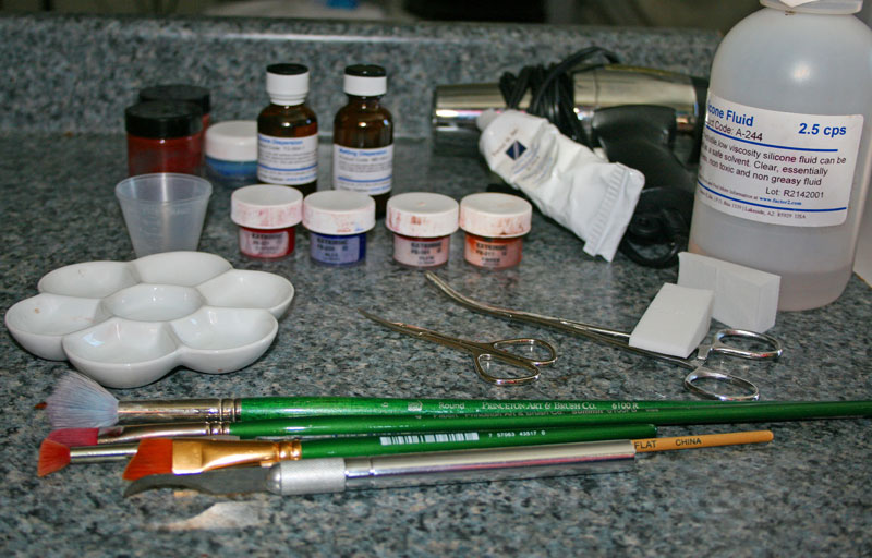 For lips, I dilute plum, umber, and some Final blushing color with silicone fluid.