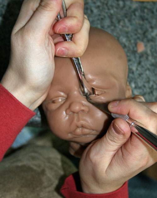 After rooting, you need to start on the eyes. If the doll’s eyes are open, you will need to cut the silicone eyeballs out using a curved blade. You do this by cutting a complete circle all the way around the eye opening.