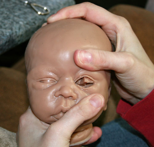 For squinty babies, you may need to trim the eyes with a dremel tool in order for the eyes to fit correctly.