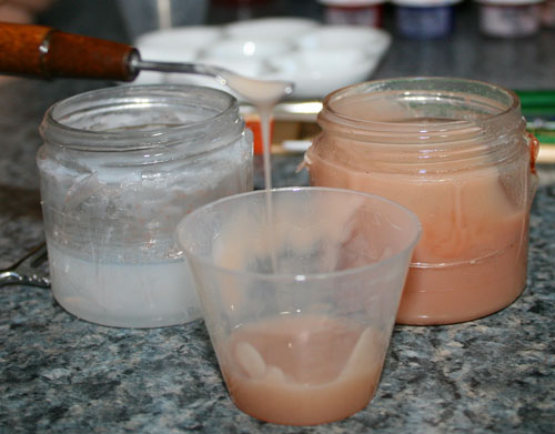 The mixture will be the consistency of warm taffy. You will take the end of a brush, dip it into the mixture, and pull away, thus making a long string of paint.
